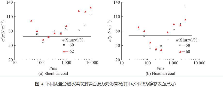 不同質(zhì)量分?jǐn)?shù)水煤漿表面張力的變化情況如圖4所示。可以看出:不同條件下水煤漿的動態(tài)表面張力變化情況比較一致,隨著特征氣泡時間(t)的增加,動態(tài)表面張力均先減小后增加,在氣泡特征時間為200 ms附近出現(xiàn)最小值;而水煤漿的動態(tài)表面張力與靜態(tài)表面張力存在顯著差異,在氣泡特征時間較小或較大時,動態(tài)表面張力均大于靜態(tài)表面張力。