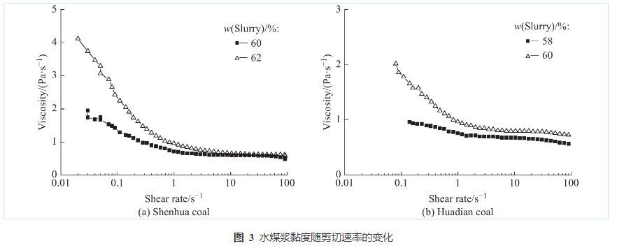 黏度、屈服應(yīng)力等水煤漿的流變特性對漿體破裂過程有重要影響。在水煤漿中,煤粉顆粒、分散劑和水形成了相對穩(wěn)定的三維空間結(jié)構(gòu),此時未被吸附、未參與形成緊密水化膜的自由水分布在這種三維結(jié)構(gòu)的空隙中。這種空間結(jié)構(gòu)在遭受剪切時很容易被破壞,從而導(dǎo)致分布在三維空間結(jié)構(gòu)空隙中的自由水被釋放,黏度降低;同時,剪切應(yīng)力越大,水煤漿的黏度越小,所以水煤漿一般為剪切變稀的假塑性流體。
