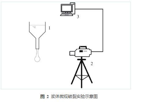 水煤漿的流變特性采用Bohlin CVO型馬爾文旋轉(zhuǎn)流變儀測量。表面張力的測量方法主要有吊片法、液滴-鼓泡法以及微觀界面面積測量法等。本實驗基于液滴-鼓泡法使用SITA science line t100型全自動表面張力儀對煤漿的動態(tài)表面張力進行了測量,并與芬蘭Kibron公司生產(chǎn)的Delta-8全自動高通量表面張力儀的靜態(tài)表面張力進行比較。采用液滴-鼓泡法測量動態(tài)表面張力時,將特制毛細(xì)管伸入待測液體,空氣經(jīng)由毛細(xì)管進入液體,毛細(xì)管出口氣泡形成外凸,氣泡的半徑也隨之連續(xù)不斷減小。氣泡在液體中受到表面張力的擠壓,氣泡半徑越小,壓力就越大,然后通過測量壓力的變化獲得表面張力。測量動態(tài)表面張力時,通過控制空氣進入毛細(xì)管的流量來改變氣泡半徑變化速率,其涉及的特征氣泡時間也稱氣泡壽命,是指在鼓泡過程中從氣泡形成外凸到氣泡半徑達(dá)到最小值的時間間隔。水煤漿破裂實驗中,漿體通過噴嘴滴出,噴嘴內(nèi)徑為4.18 mm。使用Photron Fastcam SA2型高速相機拍攝水煤漿破裂過程,并使用開源軟件ImageJ分析處理得到的圖片。漿體微觀破裂實驗示意圖如圖2所示。