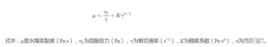 式中:是水煤漿黏度(Pa·s),為屈服應(yīng)力(Pa),為剪切速率(s?1),K為稠度系數(shù)(Pa·sn),n為流變指數(shù)。擬合關(guān)系式相關(guān)系數(shù)為0.98,擬合參數(shù)見表2。