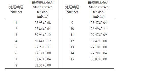1.2.1靜態(tài)表面張力測(cè)定參照文獻(xiàn)方法測(cè)定。在(25±1)℃下,用0.3 mm的鉑金環(huán)(外徑20.30 mm,周長61.89 mm,密度0.998 g/mL)在全自動(dòng)張力儀上先用純水進(jìn)行校準(zhǔn),然后測(cè)定表1中15種處理的靜態(tài)表面張力,每個(gè)試驗(yàn)至少重復(fù)3次,結(jié)果取平均值,用Origin Pro軟件(9.0版,OriginLab公司)處理數(shù)據(jù)。