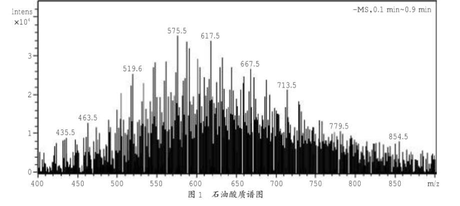 遼河原油石油酸的質(zhì)譜圖(見圖1),從圖1可以看出,石油酸相對(duì)分子質(zhì)量主要分布在400~900,且質(zhì)荷比大多數(shù)是奇數(shù),與石油酸根的相對(duì)分子質(zhì)量M=14n+45-2x相對(duì)應(yīng)。依據(jù)質(zhì)荷比計(jì)算石油酸的基本結(jié)構(gòu)信息,如:409對(duì)應(yīng)C27脂肪酸,407對(duì)應(yīng)C27單環(huán)烷酸,401對(duì)應(yīng)C27四環(huán)烷酸;605對(duì)應(yīng)C41脂肪酸,603對(duì)應(yīng)C41單環(huán)烷酸,601對(duì)應(yīng)C41雙環(huán)烷酸;599對(duì)應(yīng)C41三環(huán)烷酸,597對(duì)應(yīng)C41四環(huán)烷酸,595對(duì)應(yīng)C41五環(huán)烷酸,593對(duì)應(yīng)C41六環(huán)烷酸,591對(duì)應(yīng)C40脂肪酸;899對(duì)應(yīng)C62脂肪酸;可以確定遼河石油酸的碳數(shù)主要分布在C27~C62。對(duì)不同不飽和度的石油酸質(zhì)譜峰離子強(qiáng)度進(jìn)行歸一化,獲得不同類型石油酸的相對(duì)含量(見表3),可以看出環(huán)烷酸含量為86.58%,脂肪酸含量為13.42%。