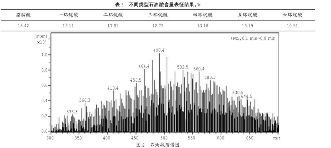 (1)萃出石油酸組分含量為3.88%,相對(duì)分子質(zhì)主要分布在400~900,碳數(shù)對(duì)應(yīng)C27~C62,結(jié)構(gòu)以環(huán)烷酸為主;
