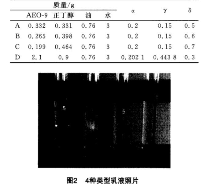 由圖1可見,在所配制的乳液中,既有均相乳液,也有兩相(上相、下相)乳液,同時(shí)有三相(中相)乳液。在選擇典型體系時(shí),應(yīng)體現(xiàn)出全面性,即以上4種類型乳液都涉及到,同時(shí)應(yīng)考慮到漸變性,即固定某個(gè)變量(此處固定γ),一種相態(tài)向另一種相態(tài)轉(zhuǎn)變。由此,選出其中4組:A(下相乳液)、B(中相乳液)、C(上相乳液)、D(均相乳液),A、B、C、D的組成如表1所示,形成的乳液照片如圖2所示。分別將乳液部分分離出來,稀釋成質(zhì)量分?jǐn)?shù)為0.1%、0.3%、0.5%、1.0%的微乳液。