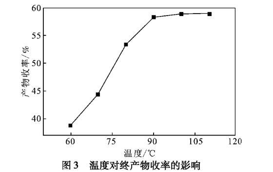 由圖3可知,GAC-312的收率隨反應溫度的升高而增大,從60℃上升至90℃過程中,產物收率的增幅很明顯,提高了多達二十個百分點;但當溫度超過90℃后,產率增加不明顯且反應體系的揮發(fā)現(xiàn)象較嚴重。這主要是因為升高反應體系溫度,活化分子數(shù)增加,有效碰撞的幾率加大,反應速率加快。但當溫度過高時,會導致副反應速率增大,同時也會提高體系揮發(fā)速率,造成N,N-二(3-氯-2-羥基丙烷-N-十二烷基仲胺)丙二胺二乙酸鈉產率提升不大,因此,N,N-二(3-氯-2-羥基丙烷)丙二胺二乙酸鈉與十二胺的最佳反應溫度確定為90℃。