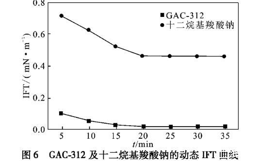 由圖6可知,羧酸鹽Gemini表面活性劑GAC-312在20 min內可將油水界面張力降至7.6×10-3mN/m(超低界面張力級別),相同條件下,十二烷基羧酸鈉將界面張力僅降低至4.54×10-1mN/m,GAC-312界面活性優(yōu)異。GAC-312能夠具備優(yōu)秀的界面活性主要是由于羧基和水之間具有較強親和力,導致GAC-312可以更快、更好地吸附在界面上,其分子在油/水界面上的排列更緊密,降低油水界面張力的能力更強。