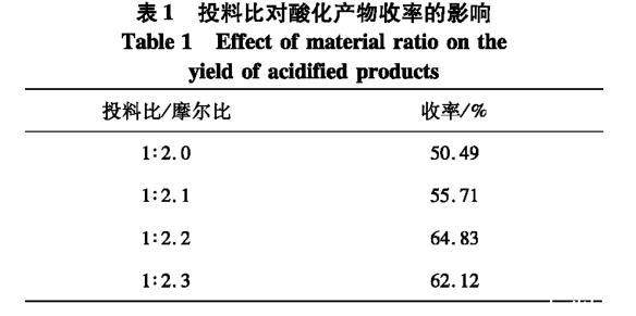 2.2.1N,N-丙二胺二乙酸鈉的合成條件優(yōu)化N,N-丙二胺二乙酸鈉的合成反應中,不同反應條件會生成不同的丙二胺取代產物;為了得到目標產物N,N-丙二胺二乙酸鈉,同時減少其它副取代產物,采用單因素分析法研究了丙二胺和氯乙酸鈉的投料比對目標產物丙二胺二乙酸鈉收率的影響。由于丙二胺二乙酸鈉溶解在混合溶劑中無法提取,因此采用酸化處理的辦法得到其酸化物N,N-丙二胺二乙酸,通過對比中間體酸化物的收率來確定合成目標中間體所需的最佳投料比(摩爾比),結果見表1。