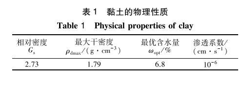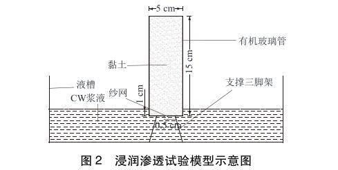 浸潤(rùn)滲透試驗(yàn)?zāi)P腿鐖D2所示,主要由液槽、支撐三腳架和透明有機(jī)玻璃管組成。有機(jī)玻璃管直徑5cm,高15cm,頂端敞開(kāi),底部封閉鉆有直徑0.5cm的進(jìn)漿孔。試驗(yàn)時(shí)將黏土裝入有機(jī)玻璃管中,振搗壓實(shí),底部開(kāi)孔處墊有紗網(wǎng),防止土體掉落。將有機(jī)玻璃管和支撐三腳架放入漿液槽內(nèi),有機(jī)玻璃管底部浸入漿液液面以下1.0cm,使?jié){液從底部滲入黏土中,通過(guò)觀察漿液在不同時(shí)間的滲透高度來(lái)評(píng)價(jià)漿液的浸潤(rùn)滲透效果。