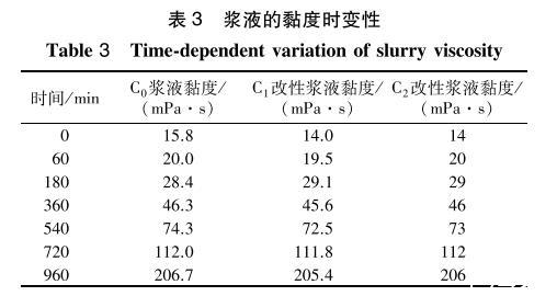 3種漿液在23℃條件下黏度隨時(shí)間變化關(guān)系見(jiàn)表3??梢钥闯?3種漿液的黏度均隨時(shí)間的增長(zhǎng)而逐漸變大,表面活性劑對(duì)漿液的初始黏度以及不同時(shí)間的黏度影響很小(最大變化≤1.8mPa·s)。說(shuō)明加入表面活性劑對(duì)漿液的黏度變化無(wú)影響。