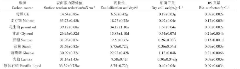 碳源對細(xì)菌的生長與發(fā)酵產(chǎn)物量有重要影響。銅綠假單胞菌(Pseudomonas aeruginosa)可在多種類型碳源下產(chǎn)生生物表面活性劑,包括甘油、乙醇、植物油等。由表3可知,以花生油為碳源,細(xì)菌發(fā)酵液的降低值為39.12 mN·m-1,明顯高于其他碳源類型;乳化值為34.17%,稍高于其他碳源,此時細(xì)菌生物量最大,糖脂含量最高,為0.30 g·L-1。雖然花生油作為碳源,能夠促進菌株產(chǎn)生更多生物表面活性劑,但如果用于實際生產(chǎn),成本相對較高,近年來一些研究者嘗試使用成本較低的工業(yè)副產(chǎn)物如糖蜜、廢潤滑油等作為碳源,發(fā)現(xiàn)也具有很好的促進微生物產(chǎn)生生物表面活性劑的作用。因此,后期會考慮選擇用一些低成本碳源進行發(fā)酵。