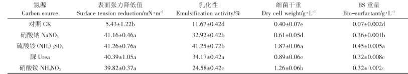表4氮源對147細(xì)菌生長以及生物表面活性劑產(chǎn)量的影響