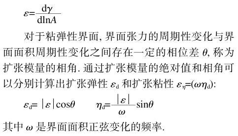 當界面受到周期性壓縮和擴張時,界面張力也隨之發(fā)生周期性變化,擴張模量ε定義為界面張力(γ)變化相對于相對界面面積(A)變化的比值。即