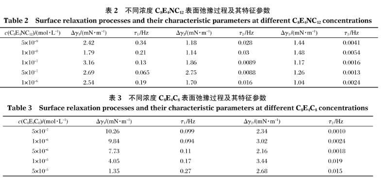 表5 C8E4C8水溶液/癸烷界面弛豫過程及其特征參數(shù)