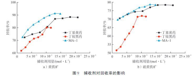 由圖9可知:黃鐵礦與磁黃鐵礦的回收率整體均隨著捕收劑用量的增加而逐漸提升;當(dāng)回收率達(dá)到峰值后,繼續(xù)增加捕收劑用量,回收率趨于穩(wěn)定狀態(tài)。相較于丁銨黑藥和丁基黃藥,MA-1作為黃鐵礦的捕收劑性能更佳。在磁黃鐵礦的浮選過(guò)程中,使用丁基黃藥和MA-1作為捕收劑時(shí),回收率差異不顯著。鑒于實(shí)際生產(chǎn)過(guò)程中簡(jiǎn)化藥劑制度和降低藥劑成本的考量,丁基黃藥更適宜作為磁黃鐵礦捕收劑。