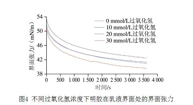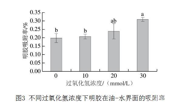 如圖3所示,乳液中油-水界面的明膠吸附率隨著過氧化氫濃度的增加而增加,從對照組的19.8%增加到30 mmol/L過氧化氫組的30.9%,增加1 倍左右,這表明更多氧化明膠分子吸附到油-水界面。Chen Jiahui等對肌原纖維蛋白進行超聲處理,發(fā)現(xiàn)超聲處理改變了肌原纖維蛋白的結構,從而有利于形成尺寸更小、更靈活的聚集體,促進蛋白質在油-水界面的吸附,減少油-水界面的界面張力。在米糠蛋白的氧化中也觀察到類似的現(xiàn)象。氧化導致米糠蛋白中暴露出更多的疏水基團,促進了蛋白質在油-水界面的吸附,形成黏彈性膜,降低界面張力,使液滴分裂成更小的尺寸。相似地,Zou Heinan等利用高強度超聲處理減小了貽貝肌漿蛋白的尺寸并增強了其表面疏水性,從而增加了蛋白質在油-水界面的吸附。