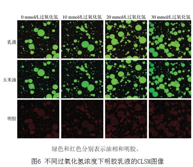如圖5所示,明膠乳液的Zeta電位隨過氧化氫濃度的增加而降低,對照組為9.61 mV,隨著過氧化氫濃度增加至30 mmol/L,Zeta電位降低至5.94 mV,降低40%。乳液液滴Zeta電位的降低也表現(xiàn)出液滴間較小的靜電斥力。據報道,靜電和空間穩(wěn)定是蛋白質乳液液滴穩(wěn)定的重要機制。在本研究中,氧化明膠乳液ESI下降可能也與乳液液滴間靜電斥力的下降有關。Yang Yaqin等通過探究pH值對蛋黃、蛋白乳化能力的影響支持這一觀點,發(fā)現(xiàn)當溶液的pH值接近蛋白質的等電點時,乳液液滴之間的靜電斥力會降低,從而加劇油滴的聚集。然而,也有研究表明,虎河豚皮明膠的乳化性能也容易受到pH值的影響。該研究發(fā)現(xiàn),對于pH 6的虎河豚皮明膠,明膠分子之間強靜電斥力可能會抑制蛋白質去折疊并阻礙蛋白質分子轉移到界面上,從而導致虎河豚皮明膠的EAI較低。而當虎河豚皮明膠pH值為8時,明膠分子之間較弱的靜電斥力可以促進蛋白質分子的去折疊并促進其向界面的遷移,從而提高EAI。此外,該研究表明,蛋白質分子間較強的靜電斥力還會破壞界面膜的穩(wěn)定性,導致ESI降低。