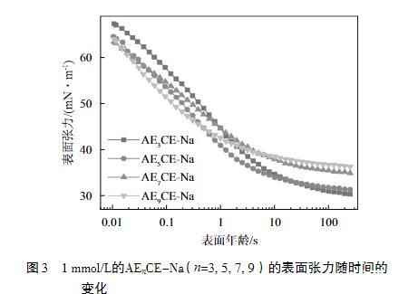 前面已經(jīng)討論了溶液平衡時的特性與規(guī)律,但沒有考慮平衡及老化的時間,而時間因素在實際應用中起著決定性的作用。當表面活性劑分子從本體相遷移到表面時,分子的動態(tài)吸附性能會影響表面活性劑的性能。因此,如圖3所示,測試了1 mmol/L的不同EO加合數(shù)的AEnCE-Na的表面張力隨時間的變化曲線。