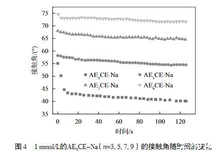 表面活性劑在有效改善疏水固體表面潤濕能力的方面起著至關(guān)重要的作用,而潤濕能力的強弱主要通過接觸角來表示。因此,測試了1 mmol/L的不同EO加合數(shù)的AEnCE-Na的接觸角隨時間的變化,結(jié)果如圖4所示。