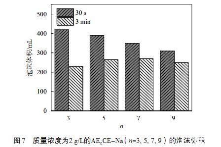 圖7質(zhì)量濃度為2 g/L的AEnCE-Na(n=3,5,7,9)的泡沫體積