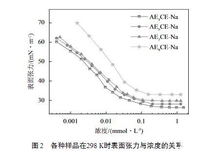 由圖3可以看出,溶液的表面張力都得到了明顯的降低。根據(jù)Rosen理論,表面張力隨時間的變化依次可分為誘導區(qū)、快速下降區(qū)、介平衡區(qū)和平衡區(qū)4個區(qū)域。但在系列AEnCE-Na樣品中,都沒有檢測到誘導區(qū),說明樣品的擴散速率都很快,已經(jīng)超過了儀器的檢測上線(10 ms)。各個樣品在檢測范圍內(nèi)最終的表面張力從大到小依次為:AE9CE-Na>AE7CE-Na>AE5CE-Na>AE3CE-Na,該結(jié)果與平衡表面張力的變化趨勢相一致。