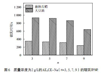 表面活性劑的另一大用途是通過降低油/水界面的界面張力而用作乳化劑,穩(wěn)定存在的乳液被廣泛應用于食品、藥品和個人護理等方面。因此,測試了不同EO加合數(shù)的AEnCE-Na對大豆油和液體石蠟的破乳時間,結(jié)果如圖6所示。