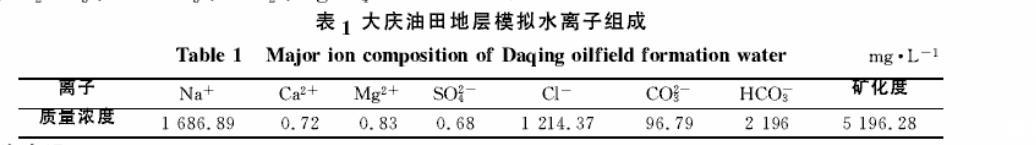 實驗用油樣為大慶原油與煤油按體積比9∶1混合而成(簡稱模擬油)。其中,大慶原油酸值為0.05 mg KOH/g;煤油由北京燕山石油化工有限公司提供,實驗前用活化后的硅膠反復(fù)吸附處理,處理后與二次蒸餾水界面張力大于48mN·m—1.實驗用Na2CO3弱堿溶液(簡稱Na2CO3溶液)由Na2CO3與蒸餾水配置,質(zhì)量分?jǐn)?shù)為0.53%.實驗用水樣為大慶油田地層模擬水(簡稱模擬水),離子組成見表1.實驗所用試劑NaCl、Na2CO3、NaHCO3、CaCl2、MgSO4均為分析純。