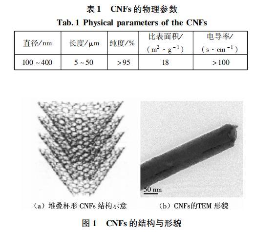 納米碳纖維(carbon nanofibers,CNFs)是近十年興起的一種新型亞微米增強纖維材料,它是化學氣相生長碳纖維的一種形式,一般通過裂解氣相碳氫化合物制備,是構成以碳黑、富勒烯、單壁和多壁碳納米管為一端,以連續(xù)碳纖維為另一端鏈節(jié)中的一環(huán).CNFs的直徑一般在150~400nm之間,與碳納米管(CNTs)相比,CNFs的制備更易于實現(xiàn)工業(yè)化生產.CNFs有著優(yōu)異的物理性能、力學性能和化學性能.研究表明,CNFs的抗拉強度可以達到2~5 GPa,平均彈性模量為300 GPa.除具有普通氣相生長碳纖維的特性,如低密度、高比模量、高比強度、高導電性等性能外,CNFs還具有缺陷數(shù)量少、比表面積大、結構致密等優(yōu)點,這使得CNFs在納米復合材料領域得到了廣泛的應用.然而,納米復合材料的性能往往會受到兩個主要因素的影響,一個是納米材料在基體材料中的分散程度,另一個是納米材料表面與基體材料之間的黏結強度和能量.由于受到范德華力的的影響,CNFs彼此吸引并相互纏結在一起,懸浮于水的表面,幾乎無法均勻溶解,這大大制約了CNFs在復合材料中的應用.如何解決CNFs在水性體系中的分散已成為研究者廣泛關注的熱點.