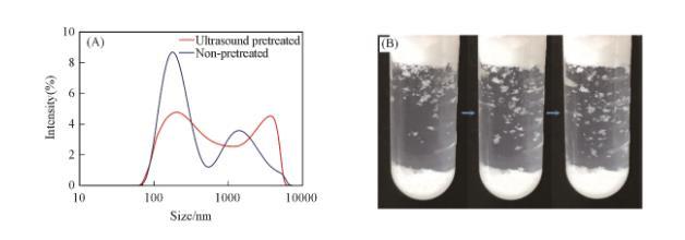 值得注意的是,如果粒子首先用超聲波分散在液體中,然后以相同的方式振蕩,則顆粒產(chǎn)生的泡沫高度有所下降[圖6(A)]。因此對比了振蕩和超聲波處理后的顆粒在液體中團聚體的粒徑大小。采用動態(tài)光散射儀間接表征了顆粒在液體中的團聚情況[圖7(A)]??梢钥闯觯袷幒蟮囊后w中有較多物質(zhì)的粒徑大于單個顆粒直徑,而且粒徑分布很寬。這證明液體中存在明顯的顆粒團聚體。由于顆粒本身存在巨大的表面能,多數(shù)顆粒在空氣中已經(jīng)自發(fā)團聚。顆粒在液體中大多也以團聚體的方式存在。少量空氣被密封在浸沒于油相中的顆粒團聚體內(nèi)部,這部分不與外界聯(lián)通的空氣提供了額外的壓力,進而阻止了進一步滲透。這種顆粒團聚體表面同樣形成了由Cassie-Baxter方程描述的復(fù)合表面,該復(fù)合表面的形成保護了構(gòu)成團聚體的顆粒不被完全潤濕,并使團聚體表面具有合理的疏油性(cosθ_CB的值接近0),從而在熱力學上團聚體便于發(fā)生吸附。而溶液經(jīng)超聲波處理后顆粒被潤濕,團聚體被破壞使尺寸變小,并且均勻分布在溶液中。圖6(B)顯示了在經(jīng)超聲波處理后的表面張力測試數(shù)據(jù),同樣表明團聚體被破壞后,被潤濕的顆粒不再傾向于吸附在表面上。