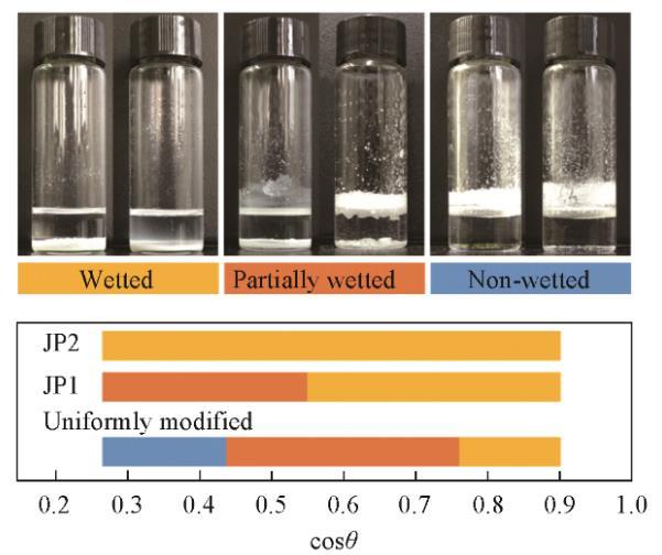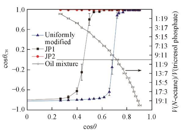 放置在靜止液體表面的顆粒的潤濕行為由圖5示出。隨著液體表面張力的增加,從光滑的氟碳鏈覆蓋的表面獲得的cosθ值同時增大,液體頂部的表面出現(xiàn)明顯的不溶顆粒。這種顆粒不潤濕的情況與顆粒形成粗糙表面測量的結(jié)果具有相關(guān)性。干燥的顆粒以蓬松狀態(tài)直接向油相傾倒,如果在油相表面能形成足夠強壯的、由顆粒組成的亞穩(wěn)態(tài)Cassie-Baxter狀態(tài),那么疏油表面將會形成,并阻止其它顆粒接觸油相,宏觀表現(xiàn)為顆粒不潤濕。相反,如果油相表面由顆粒組成的亞穩(wěn)態(tài)Cassie-Baxter狀態(tài)魯棒性不足,在手動振蕩或重力作用下,顆?;蝾w粒團聚體接觸油相并浸沒在油相中。亞穩(wěn)態(tài)魯棒性與顆粒表面材料潤濕角密切相關(guān),即不同類型的顆粒具有明顯不同的潤濕轉(zhuǎn)折點。JP1潤濕性轉(zhuǎn)折點位于均勻修飾顆粒右側(cè),JP2沒有發(fā)現(xiàn)潤濕轉(zhuǎn)折點。這與顆粒上接枝的烷烴鏈數(shù)量有關(guān)。JP2上盡管存在氟碳鏈,但由于烷烴鏈覆蓋的面積太大,使顆粒整體表現(xiàn)出強烈的親油性。