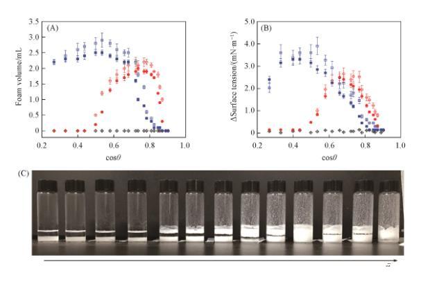然而,顆粒在超聲波的作用下依舊產(chǎn)生了泡沫。這是由于顆粒數(shù)量多,顆粒團聚體尺寸變得十分巨大,并出現(xiàn)明顯沉淀。超聲波無法把這些團聚體完全破壞。受超聲波作用,團聚體被分散成更小的狀態(tài),但依舊有十分明顯的沉淀。在用手劇烈振蕩之后,無論顆粒是否被超聲波處理過,均有機會重新形成更大的、肉眼可見的團聚體[圖7(B)],這說明顆粒團聚體是產(chǎn)生泡沫的關(guān)鍵。結(jié)合圖4和圖6結(jié)果,以粗糙表面代表的顆粒團聚體表面接觸角在θ_CB為90°(cosθ_CB=0)附近具有最多的泡沫體積和最大的表面張力降低值,而對應(yīng)的θ均小于70.1°(cosθ > 0.39),這表明顆粒在油氣表面上吸附并起泡需要顆粒團聚體的Cassie-Baxter復(fù)合表面的接觸角θ_CB約為90°,而對應(yīng)的顆粒的本征接觸角θ則小于70.1°,不需要單個顆粒潤濕角必須接近90°。