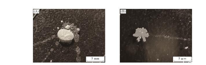 在顆粒參與形成“泡沫”過程中,存在另外一種現(xiàn)象(見圖8)。在磷酸三甲酚酯溶液中,顆粒附著在液氣表面上,有可能形成氣相為連續(xù)相、液相為非連續(xù)相的狀態(tài)[圖8(A)]。在無外力作用下,該液滴能夠保持長時間穩(wěn)定。如果推動液滴,顆粒從氣液表面脫落[圖8(B)],則液滴破碎,留下一層顆粒組成的薄膜。