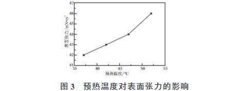 2.4 電暈預(yù)熱溫度對(duì)BOPP薄膜表面張力的影響