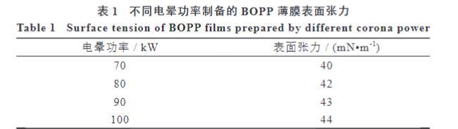 電暈功率的變化引起了BOPP薄膜表面化學(xué)組成的變化,會(huì)進(jìn)一步導(dǎo)致BOPP薄膜表面張力的改變。為了考察電暈功率對(duì)BOPP薄膜表面張力的具體影響規(guī)律,測試了在47℃預(yù)熱溫度條件下用不同電暈功率制備的BOPP薄膜剛下線時(shí)的表面張力,結(jié)果見表1。
