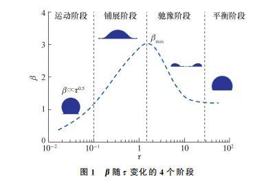 根據(jù)β隨τ變化情況,液滴碰撞分為運(yùn)動(dòng)、鋪展、弛豫和平衡4個(gè)階段,如圖1所示。在運(yùn)動(dòng)階段(τ<0.1),慣性力占主導(dǎo)地位,液滴上部仍保持球狀,下部鋪展成楔形邊緣,文指出該階段可忽略流體性質(zhì)影響,β隨τ呈指數(shù)上升,即β∝τb,其中指數(shù)b介于0.45到0.57之間,一般取b=0.5;在鋪展階段,受黏性力或毛細(xì)力的主導(dǎo)作用,β逐漸增至βmax,然后液滴開(kāi)始回撤收縮,進(jìn)入馳豫階段;在平衡階段,液滴可能穩(wěn)定鋪展,也可能發(fā)生反彈,或者碎裂飛濺。本文主要針對(duì)運(yùn)動(dòng)階段和鋪展階段進(jìn)行研究。