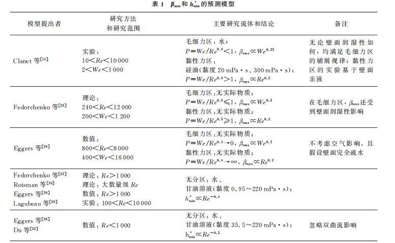 βmax和hmin*的多種預(yù)測(cè)模型如表1所示。從表1可以看出,在黏性力區(qū),已有的理論、實(shí)驗(yàn)和模擬研究普遍認(rèn)為βmax主要由Re控制,與Re0.2成正比,但目前實(shí)驗(yàn)數(shù)據(jù)和模擬驗(yàn)證均較少,已有實(shí)驗(yàn)主要針對(duì)硅油、甘油溶液,黏度在300 mPa·s以內(nèi),缺乏對(duì)于更高黏度液體的研究;另外,Eggers等的模擬研究不針對(duì)真實(shí)流體,且忽略空氣影響和假設(shè)壁面完全疏水,與現(xiàn)實(shí)情況具有差異。在毛細(xì)力區(qū),盡管Eggers等的模擬結(jié)果與Fedorchenko等的理論相符合,都認(rèn)為βmax∝We0.5,但Clanet等的實(shí)驗(yàn)結(jié)果卻表明βmax∝We0.25,實(shí)驗(yàn)所得We指數(shù)大小僅為理論的一半。因此,仍需對(duì)βmax進(jìn)行更多的實(shí)驗(yàn)、模擬研究。