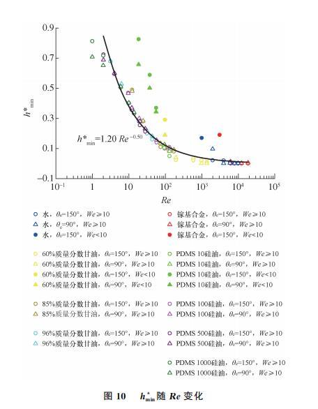 如表1所示,文認(rèn)為hmin僅與Re相關(guān)。從圖9中甘油溶液和PDMS硅油的曲線可以看出,二者Re相近,hmin幾乎相同,與已有結(jié)論一致;但對于We相近、Re相差較大的水和鎵基合金,二者也有相似的hmin.因此,hmin是否僅與Re相關(guān),需要進一步探討。