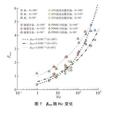 本文在毛細(xì)力區(qū)研究的流體包括水、60%質(zhì)量分?jǐn)?shù)甘油溶液、PDMS10硅油和鎵基合金,βmax隨We變化的情況如圖7所示。對不同潤濕性壁面的模擬結(jié)果進行擬合,如圖7中虛線所示:當(dāng)θe=90°時,βmax∝We0.26(R2=0.921);當(dāng)θe=180°時,βmax∝We0.40(R2=0.990);當(dāng)θe=150°時,βmax∝We0.29(R2=0.918),介于前兩者之間。因為真實表面無法絕對疏水,所以Clanet等實驗研究結(jié)果βmax∝We0.25更接近本文θe=90°的模擬結(jié)果,而Eggers等針對完全疏水表面提出的βmax∝We0.5更適用于θe=180°的情況。