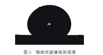 將制備的玻璃樣塊用錫紙包裹,用鐵錘捶碎后用鉗子修整成較方正的顆粒,選取內(nèi)部無氣泡結(jié)石且質(zhì)量為0.15~0.30g的碎塊用于測試。測試前選用T4溫度表面張力為334 mN/m的標(biāo)準(zhǔn)鈉鈣玻璃校準(zhǔn)表面張力測量儀。測試的具體操作步驟如下:將表面張力測量儀加熱爐升溫至測量溫度,通入高純氮氣作為保護(hù)氣體,然后將制備好的玻璃樣品置于石墨片上,送入加熱爐中的樣品臺上進(jìn)行保溫,試樣在表面張力作用下收縮成橢球狀液滴,如圖3所示,將液滴置于拍攝裝置視野中心,保溫30 min至熔體穩(wěn)定。隨后,用圖像采集裝置獲取橢球熔體的外輪廓線,通過軟件數(shù)值分析得到輪廓參數(shù),利用Young-Laplace方程進(jìn)行解析,計算出樣品的表面張力(σ),反復(fù)測試若干次后取σ的平均值為樣品在該測試條件下的表面張力值。