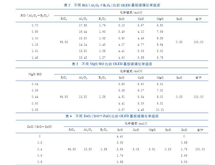 根據(jù)開發(fā)需求,本文設(shè)計了四組不同化學(xué)組成的OLED基板玻璃。如表1~表4所示,分別通過改變組成中的Al?O?/SiO?、RO/(Al?O?+B?O?)、MgO/RO和ZnO/(SrO+ZnO),研究表面惰性組分和表面活性組分的相對含量,以及同堿土金屬氧化物網(wǎng)絡(luò)作用相似但活性更強(qiáng)的過渡金屬氧化物對無堿鋁硅酸鹽玻璃表面張力的影響。