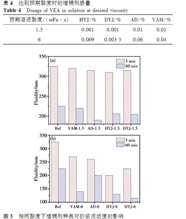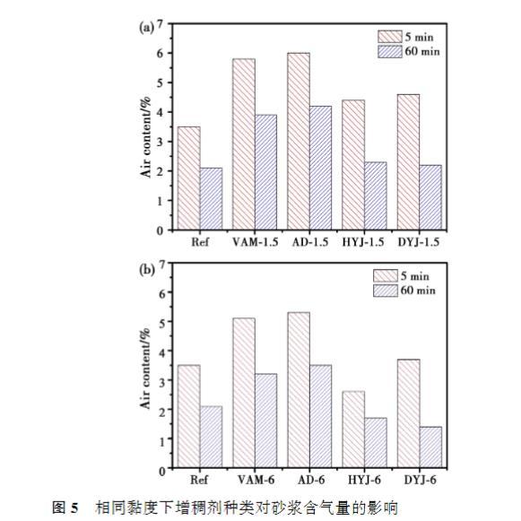 增稠劑溶液的黏度越高,砂漿的流動度越低。在較低黏度下,四種增稠劑對砂漿初始流動度的影響接近,60min時,AD的經時流動度最低,VAM流動度相對于基準砂漿略微下降;然而當溶液黏度提高至6mPa·s時,摻入HYJ和DYJ的砂漿流動度顯著低于AD和VAM,60min后的損失也更大,AD的經時流動度略低于基準砂漿。
