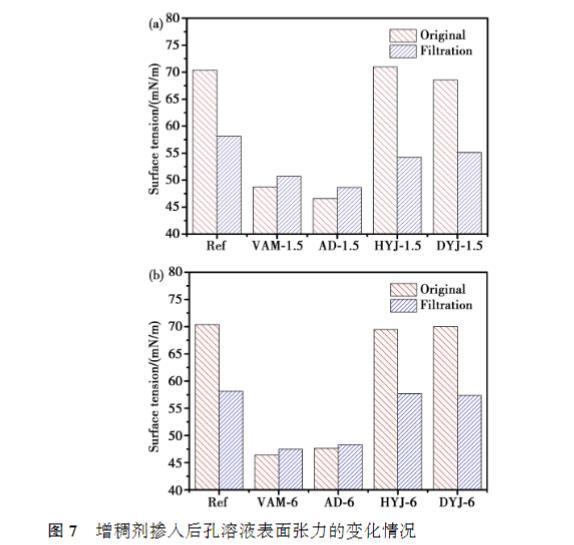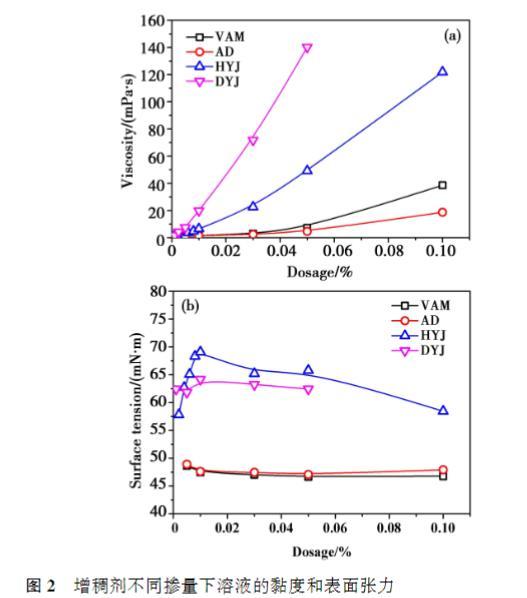 相同摻量下,DYJ的黏度最高,其次是HYJ,VAM和AD黏度在低摻量下接近,摻量達到0.10%之后,VAM黏度高于AD;VAM和AD的黏度隨著摻量的提高緩慢增大,而HYJ和DYJ溶液的黏度隨摻量的提高迅速提高,尤其是DYJ的增長幅度更為顯著??傮w來看,增稠劑分子量越大,相同摻量時溶液的黏度越高。從表面張力的結果來看,相同摻量下,HYJ溶液的表面張力最高,其次是DYJ,VAM和AD的表面張力顯著低于其他兩種增稠劑,且AD略微高于VAM.