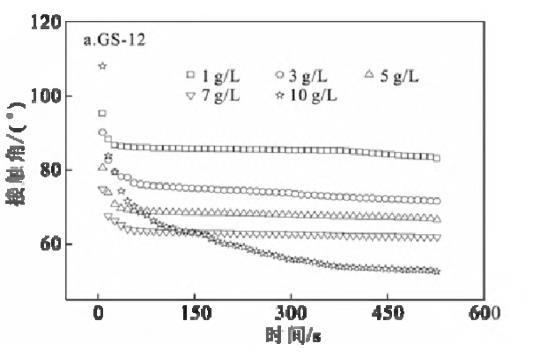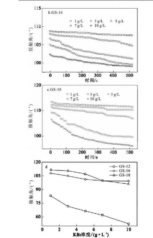 在KBr濃度區(qū)間1~10 g/L內(nèi),GS-12隨著KBr濃度的增加,接觸角顯著減小,而GS-16和GS-18則變化不明顯??梢越忉尀?對(duì)于GS-12而言,KBr濃度越高,固/液界面處的填料越緊密,導(dǎo)致氣/液固界面張力值降低,而疏水鏈較長(zhǎng)的GS-16和GS-18其自身降低界面張力的能力有限,所以,隨KBr濃度增加,接觸角變化有限[1,19]。此外,隨著KBr濃度的增加,液滴在石蠟?zāi)ど系慕佑|角值減小。