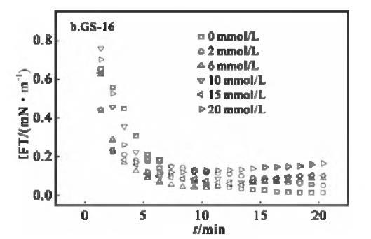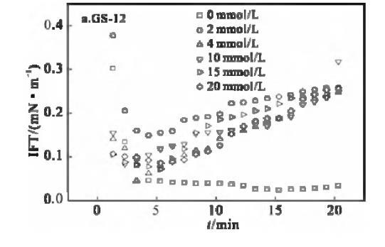 表面活性劑/油體系的動(dòng)態(tài)界面張力行為,對(duì)驅(qū)油過程具有重要意義。動(dòng)態(tài)界面張力是驅(qū)油過程中各種復(fù)雜物理化學(xué)反應(yīng)的具體體現(xiàn)。因此,研究動(dòng)態(tài)界面增長(zhǎng)力及其影響因素非常重要。溶液中離子強(qiáng)度增加,將影響表面活性劑分子在水相中的溶解度,改變雙電層參量,而導(dǎo)致油水界面表面活性劑濃度的改變。一般情況下,添加的鹽可以通過中和表面活性劑分子在界面上頭基的電荷來減弱表面活性劑分子之間的靜電斥力,導(dǎo)致IFT降低[5]。溫度為30℃下,不同KBr鹽濃度下,GS-12,GS-16的煤油/表面活性劑溶液界面張力隨時(shí)間的變化曲線見圖6。