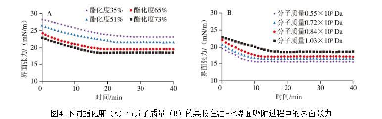 圖4不同酯化度(A)與分子質(zhì)量(B)的果膠在油-水界面吸附過(guò)程中的界面張力