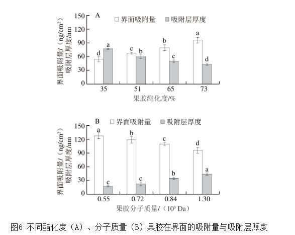 圖6不同酯化度(A)、分子質(zhì)量(B)果膠在界面的吸附量與吸附層厚度