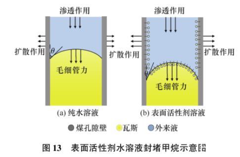 毛細(xì)管力與溶液表面張力成正比、與孔隙半徑成反比;同時(shí),接觸角越小,毛細(xì)管力越大。由表5可知,朱鍇[21]試驗(yàn)并計(jì)算煤樣10 nm孔徑的毛細(xì)力,發(fā)現(xiàn)自配的表面活性劑水溶液能夠使毛細(xì)力平均提高2倍,最大提高4.03倍。如圖13所示,在擴(kuò)散、滲透和毛細(xì)力共同作用下,表面活性劑水溶液沿著煤體表面、孔隙和裂隙進(jìn)入煤體內(nèi)部產(chǎn)生液相滯留效應(yīng),增大煤潤(rùn)濕效果的同時(shí)其內(nèi)部瓦斯流動(dòng)阻力變大,孔隙內(nèi)瓦斯氣體被水溶液封堵。因此,添加活性劑水溶液能夠減小水溶液的表面張力、降低水溶液與煤之間的接觸角,增強(qiáng)煤的潤(rùn)濕效果,達(dá)到抑制煤層瓦斯的解吸、延緩采動(dòng)煤巖體中瓦斯逸散的目的,從而降低開采工作面瞬時(shí)瓦斯涌出量。也有學(xué)者[21,29,32]分析認(rèn)為,添加表面活性劑水溶液會(huì)降低煤體溫度、增強(qiáng)煤吸附瓦斯的能力,使得部分游離態(tài)瓦斯轉(zhuǎn)變?yōu)槲綉B(tài),相應(yīng)地減少了瓦斯氣體的逸散涌出。